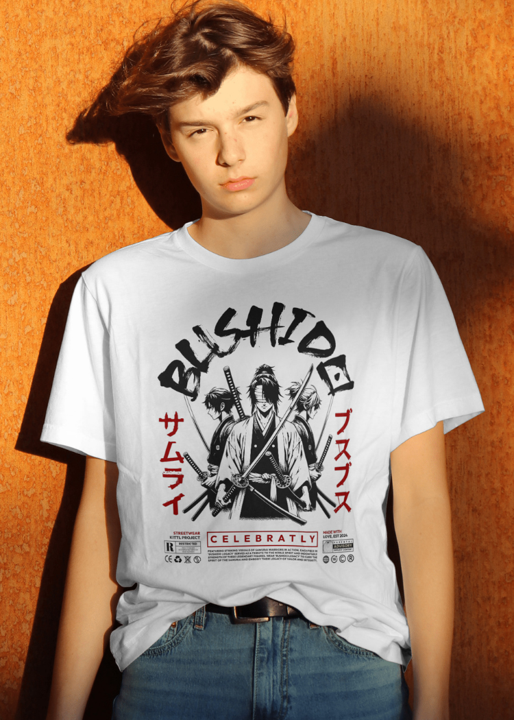 A stylish white T-shirt featuring a bold black-and-red Bushido samurai design inspired by Japanese anime and streetwear culture. The artwork showcases three fierce samurai warriors with swords, surrounded by Japanese typography, making it a perfect fashion statement for anime fans, manga lovers, and streetwear enthusiasts.