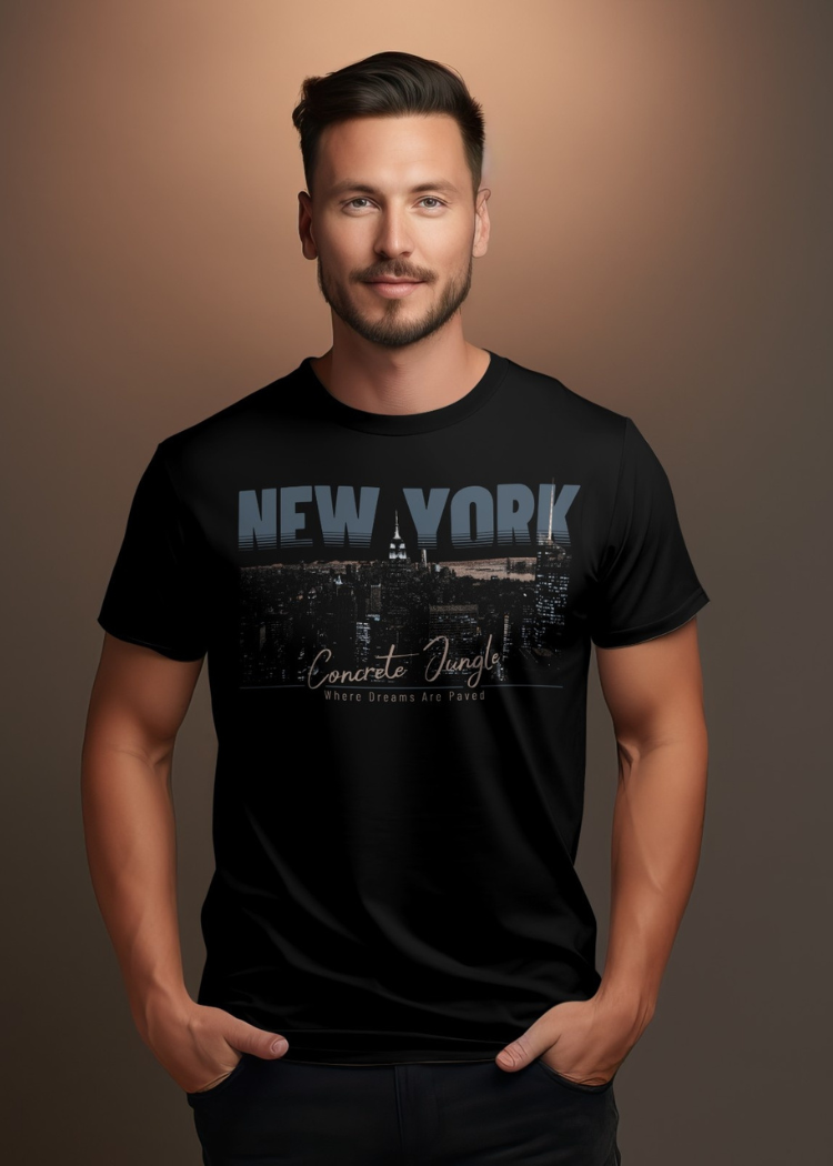 Step into city vibes with this black New York graphic T-shirt featuring a stunning skyline print and bold typography. Perfect for casual outings, travel, or streetwear styling, this tee brings comfort and fashion together. Crafted from soft, breathable fabric, it’s designed for all-day wear while showcasing your love for the city that never sleeps.