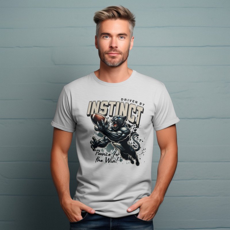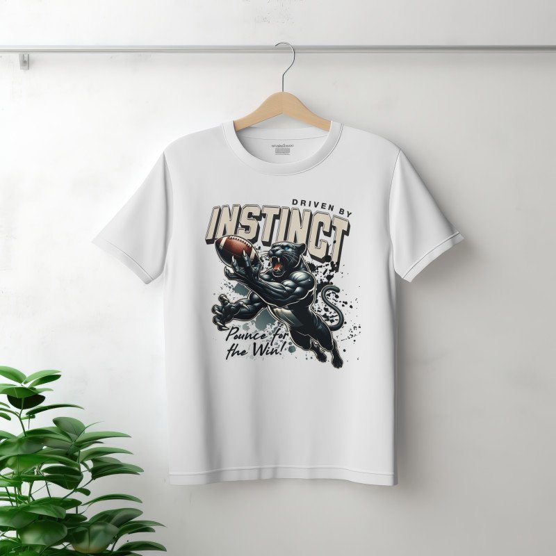 Unleash your wild side with this Driven by Instinct T-Shirt featuring a fierce panther pouncing with a football. Designed for athletes, sports fans, and streetwear lovers, this bold graphic tee blends power, style, and comfort. The dynamic design with the phrase “Pounce for the Win!” makes it perfect for casual wear, game day outfits, or everyday motivation. Made with soft, breathable fabric, it ensures comfort while keeping your look sharp and sporty.