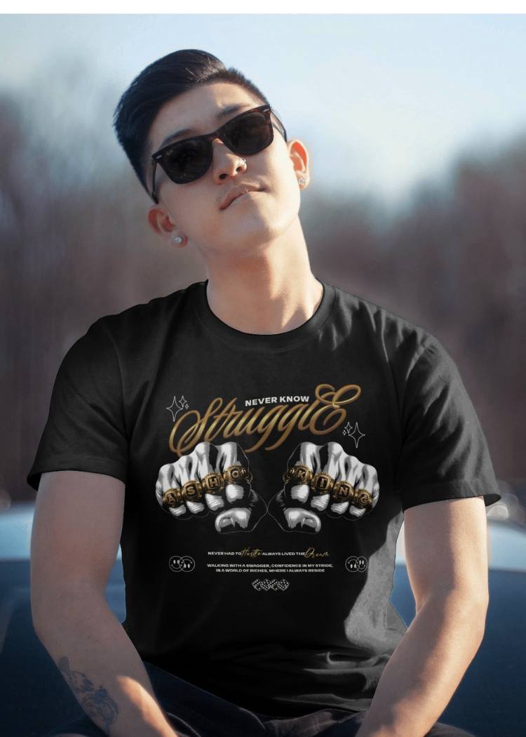 Make a bold statement with this Never Know Struggle T-Shirt, designed for those who carry confidence and power in their stride. Featuring a striking fist graphic with gold lettering and motivational text, this tee combines streetwear edge with urban fashion vibes. Perfect for casual wear, hip-hop culture lovers, or anyone who lives life with strength and style.