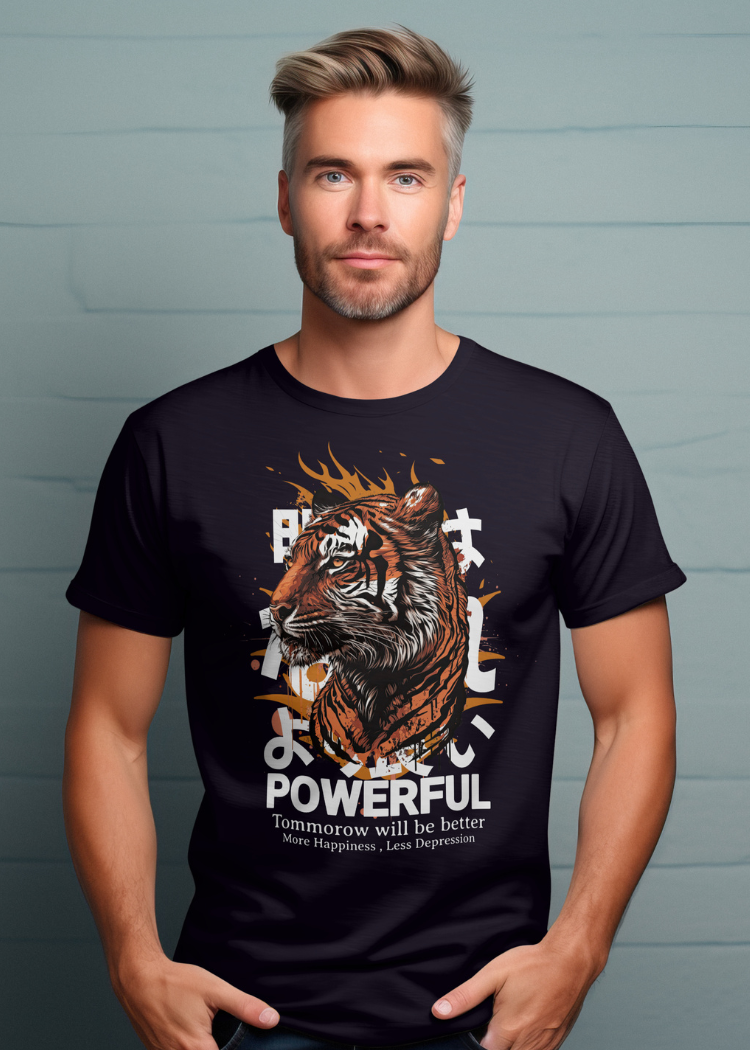Unleash your inner strength with this bold Powerful Tiger Graphic T-Shirt. Featuring a striking tiger artwork with motivational text, this tee inspires confidence and positivity: “Tomorrow will be better – More Happiness, Less Depression.”